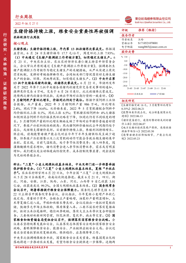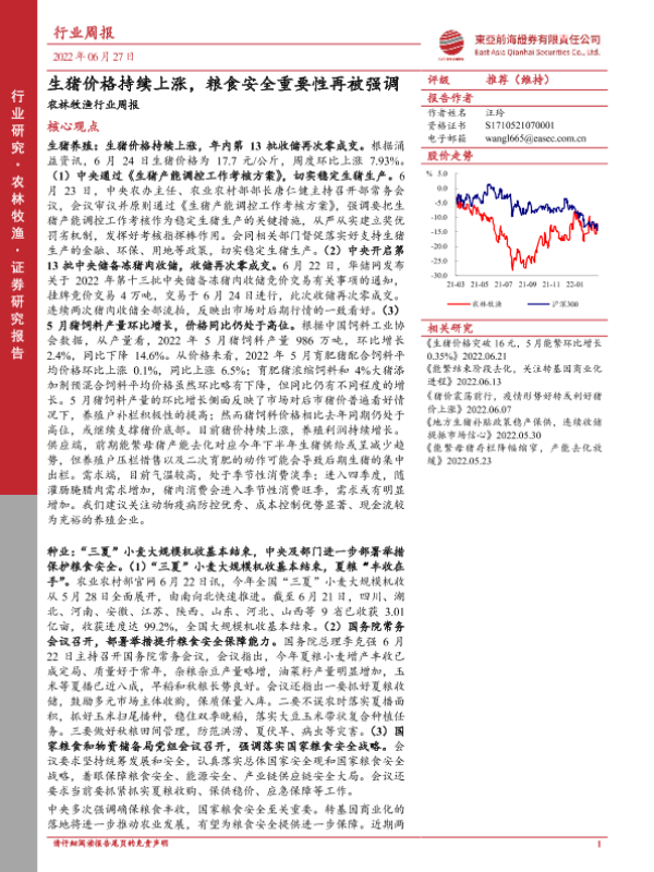 【东亚前海证券】【20220627】20220627-东亚前海证券-农林牧渔行业周报:生猪价格持续上涨,粮食安全重要性再被强调-19页
