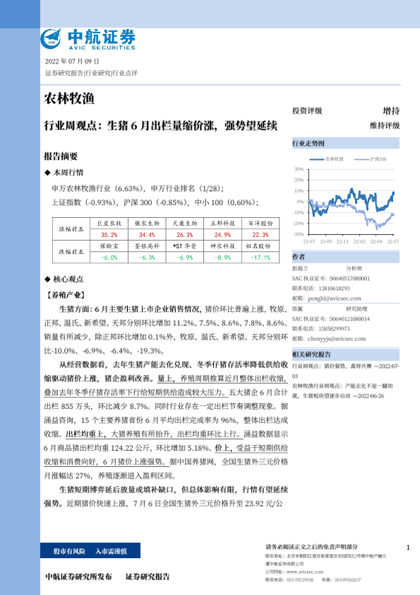 【中航证券】【20220709】20220709-中航证券-农林牧渔行业周观点:生猪6月出栏量缩价涨,强势望延续-13页