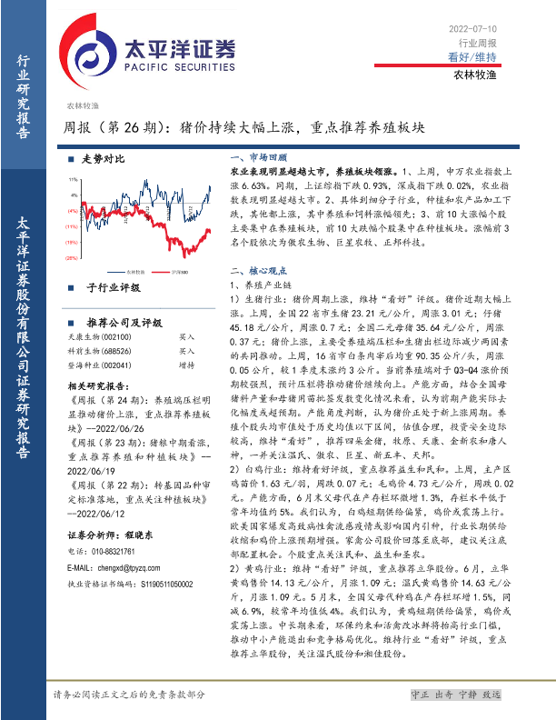 【太平洋证券】【20220710】20220710-太平洋-农林牧渔周报(第26期):猪价持续大幅上涨,重点推荐养殖板块-16页