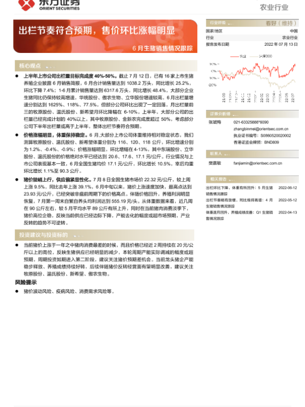 【东方证券】【20220713】农业:6月生猪销售情况跟踪:出栏节奏符合预期,售价环比涨幅明显-8页