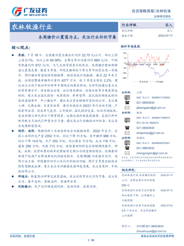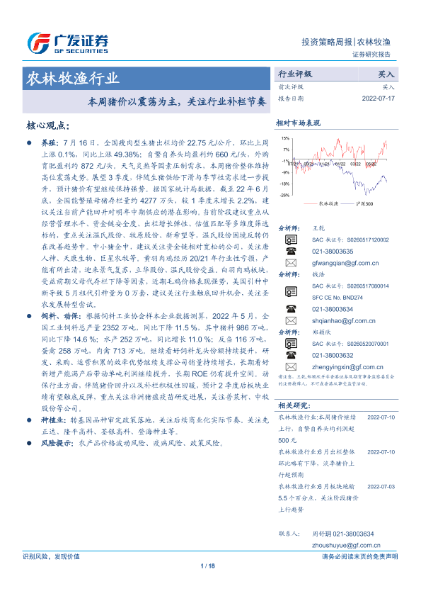 【广发证券】【20220717】20220717-广发证券-农林牧渔行业投资策略周报:本周猪价以震荡为主,关注行业补栏节奏-18页