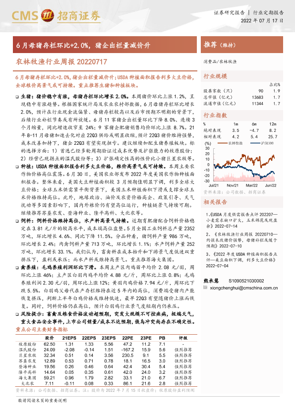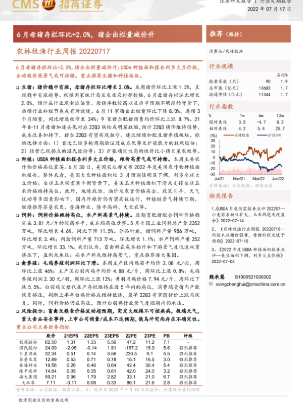 【海通证券】【20220717】农林牧渔行业周报:6月母猪存栏环比+2.0%,猪企出栏量减价升-11页
