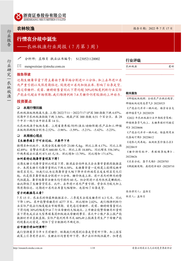 【浙商证券】【20220717】20220717-浙商证券-农林牧渔行业周报(7月第3周):行情在分歧中诞生-18页