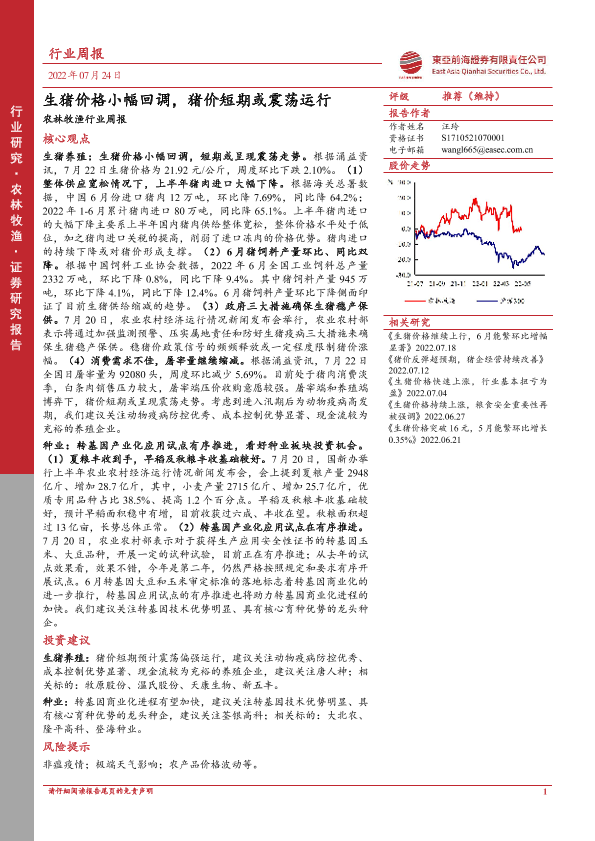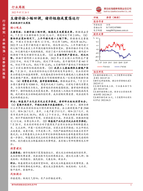 【东亚前海证券】【20220724】20220724-东亚前海证券-农林牧渔行业周报:生猪价格小幅回调,猪价短期或震荡运行-17页