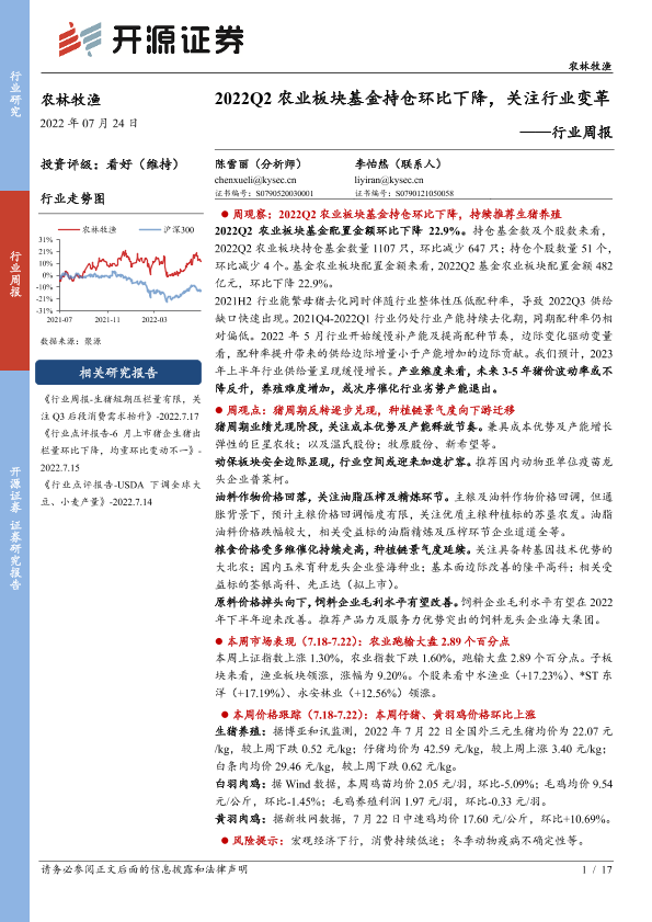 【开源证券】【20220724】农林牧渔行业周报:2022Q2农业板块基金持仓环比下降,关注行业变革-17页