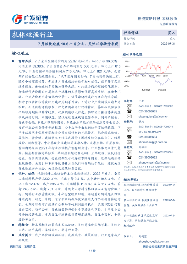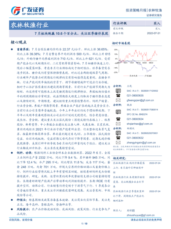 【广发证券】【20220731】20220731-广发证券-农林牧渔行业投资策略月报:7月板块跑赢10.6个百分点,关注旺季猪价表现-19页
