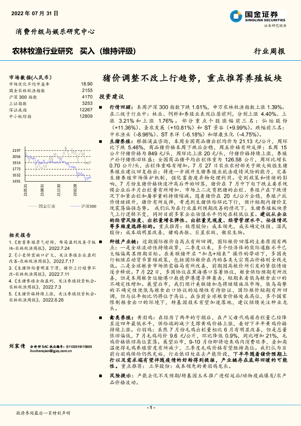 【国金证券】【20220731】20220731-国金证券-农林牧渔行业周报:猪价调整不改上行趋势,重点推荐养殖板块-16页