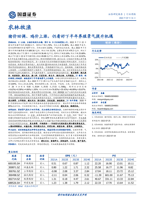 【国盛证券】【20220731】20220731-国盛证券-农林牧渔行业周报:猪价回调、鸡价上涨,仍看好下半年养殖景气提升机遇-17页