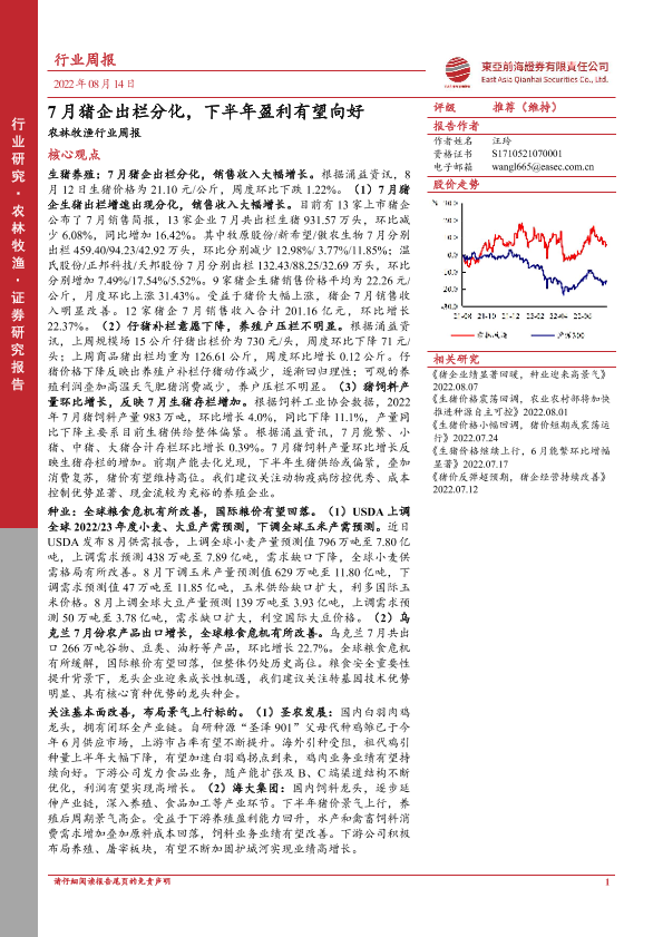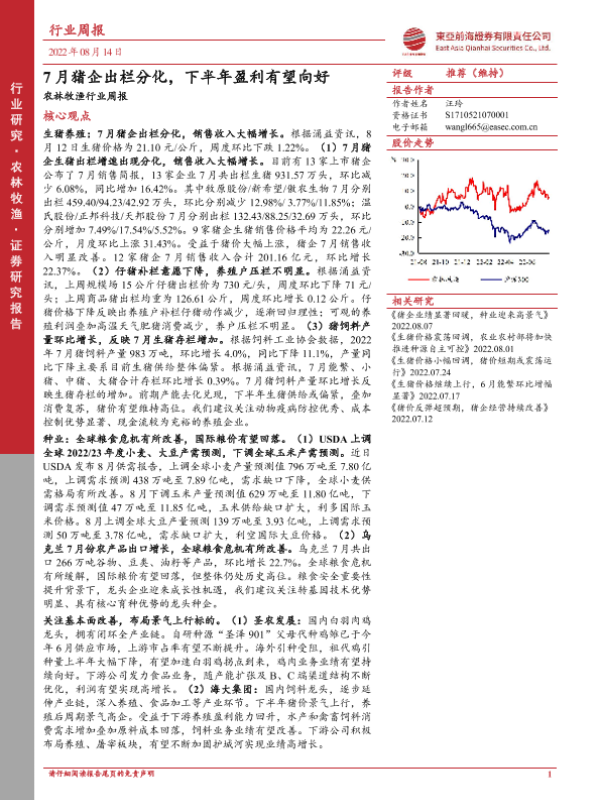 【东亚前海证券】【20220814】20220814-东亚前海证券-农林牧渔行业周报:7月猪企出栏分化,下半年盈利有望向好-19页