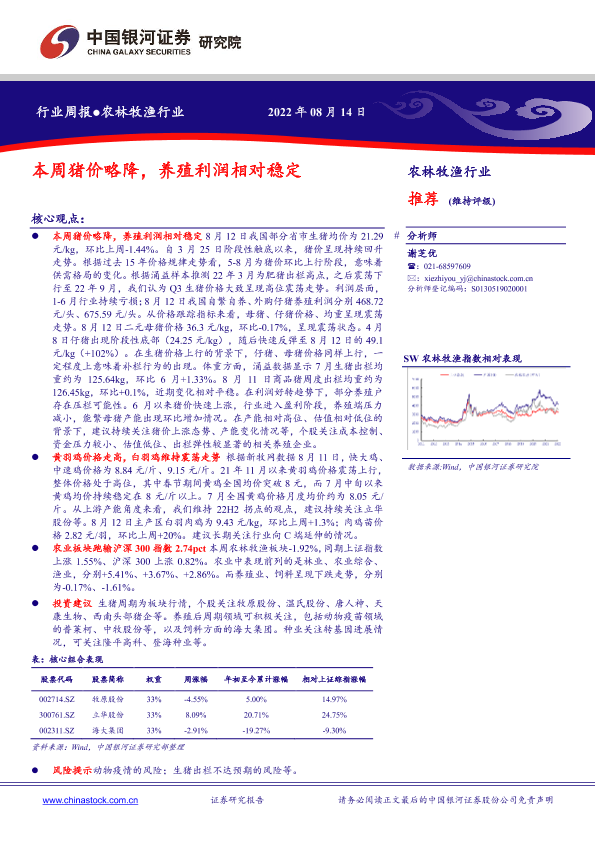 【银河证券】【20220814】20220814-中国银河-农林牧渔行业周报:本周猪价略降,养殖利润相对稳定-17页