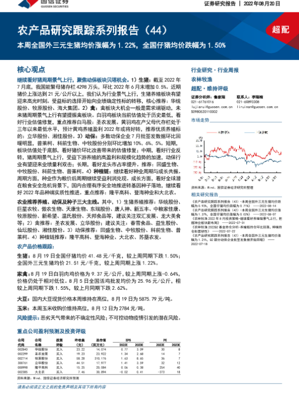 【国信证券】【20220820】20220820-国信证券-农产品研究跟踪系列报告(44):本周全国外三元生猪均价涨幅为1.22%,全国仔猪均价跌幅为1.50%-21页