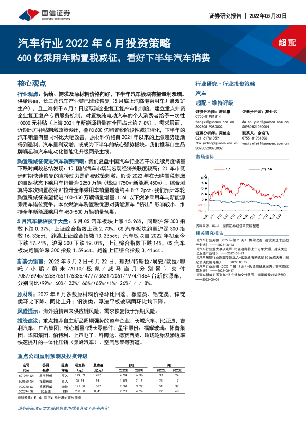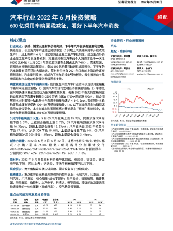 【国信证券】【20220530】汽车行业2022年6月投资策略:600亿乘用车购置税减征,看好下半年汽车消费-36页