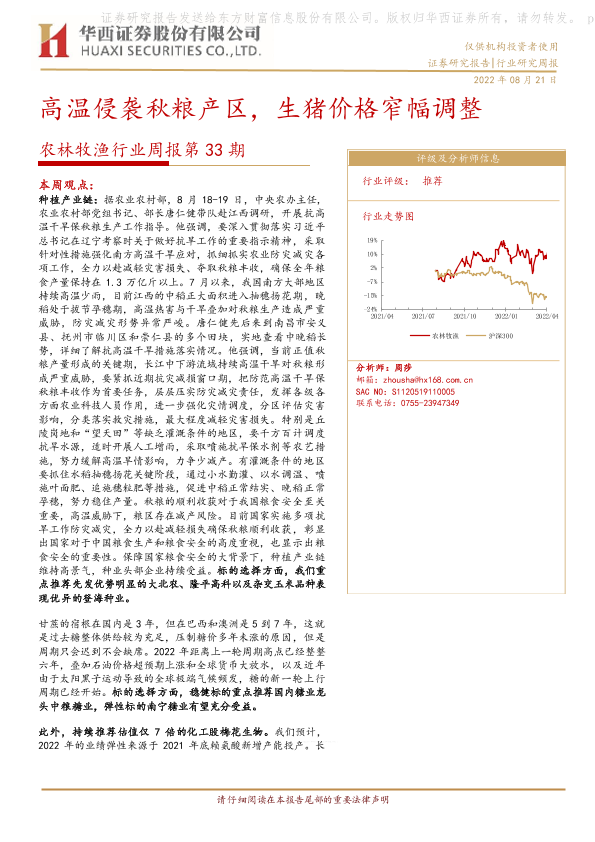 【华西证券】【20220821】农林牧渔行业周报第33期:高温侵袭秋粮产区,生猪价格窄幅调整-26页