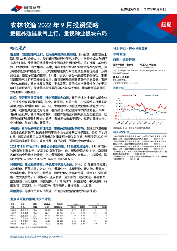 【国信证券】【20220828】农林牧渔2022年9月投资策略:把握养殖链景气上行,重视种业板块布局-28页