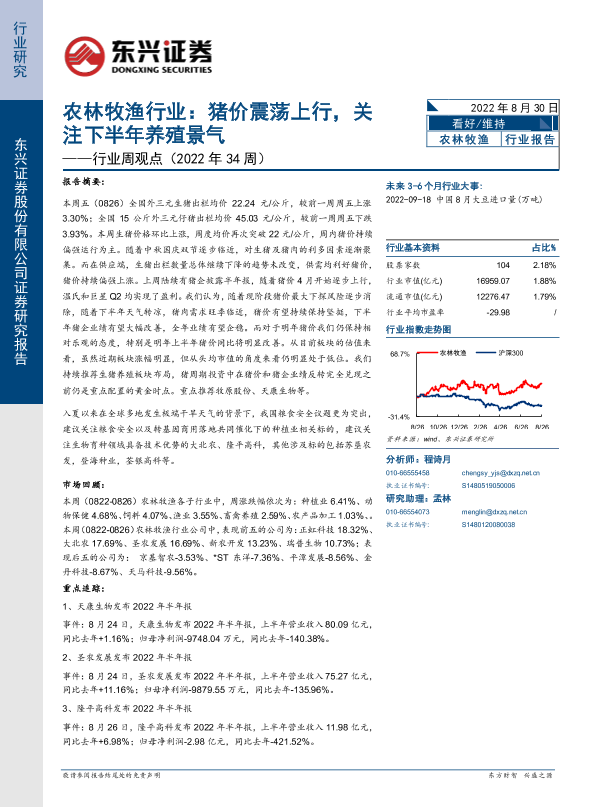 【东兴证券】【20220830】农林牧渔行业:猪价震荡上行,关注下半年养殖景气-14页