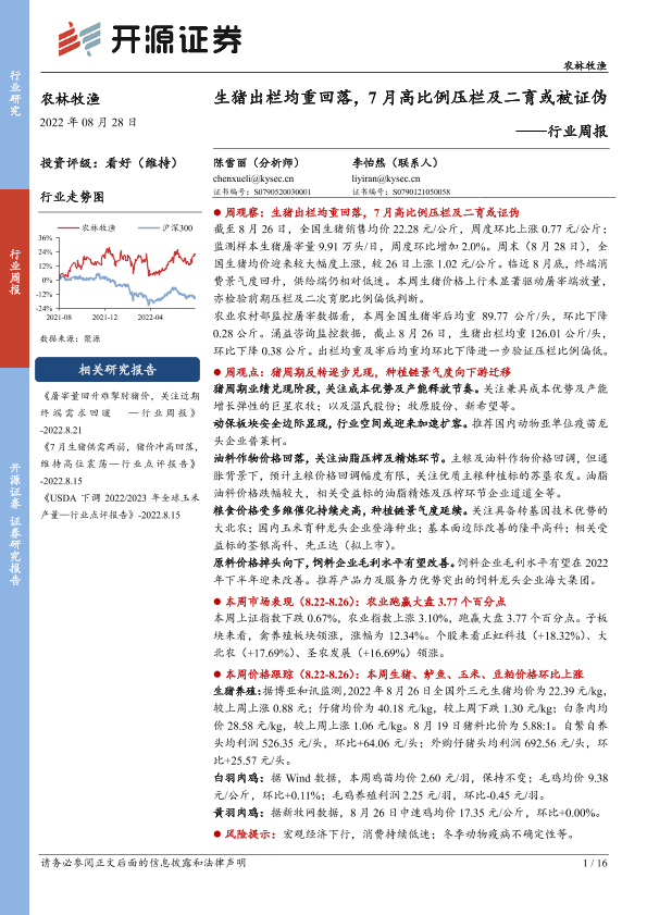 【开源证券】【20220828】农林牧渔行业周报:生猪出栏均重回落,7月高比例压栏及二育或被证伪-16页