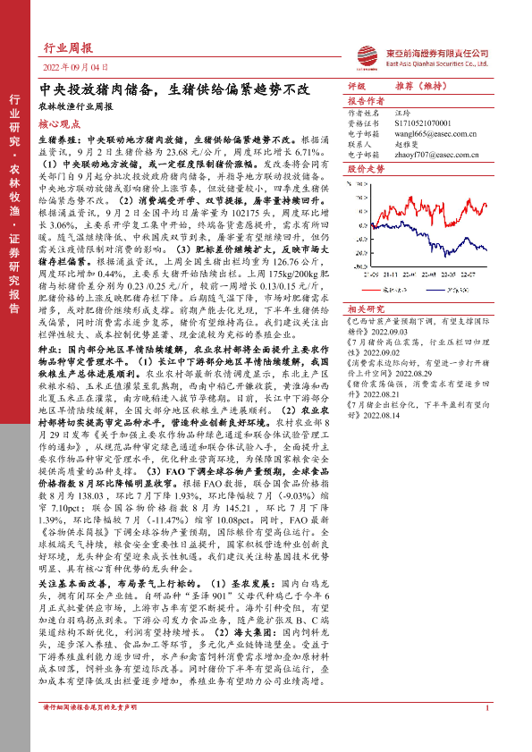 【东亚前海证券】【20220904】20220904-东亚前海证券-农林牧渔行业周报:中央投放猪肉储备,生猪供给偏紧趋势不改-18页