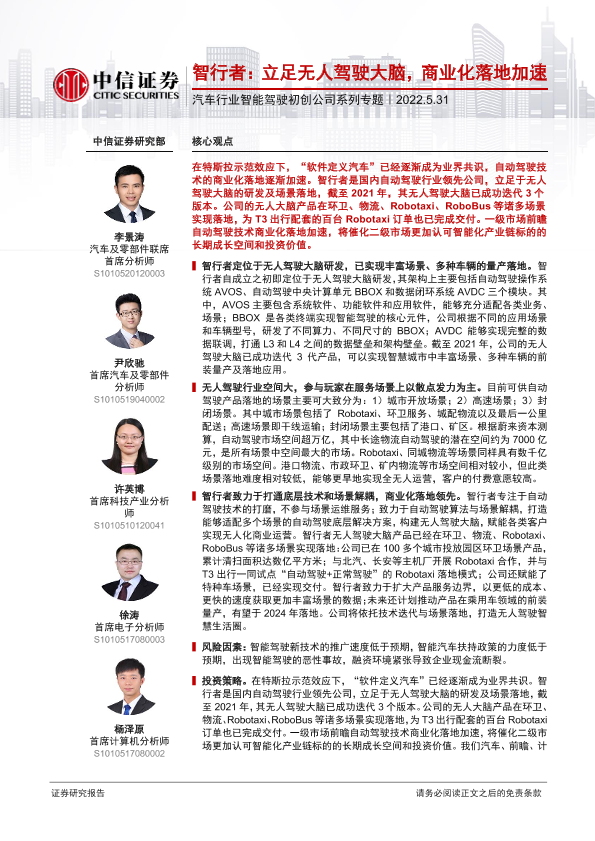 【中信证券】【20220531】汽车行业智能驾驶初创公司系列专题:智行者,立足无人驾驶大脑,商业化落地加速-29页
