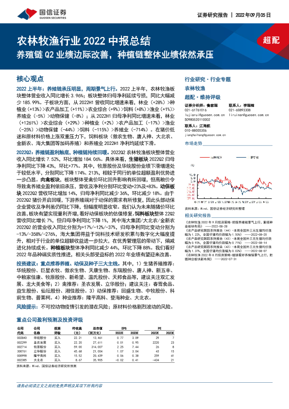 【国信证券】【20220905】农林牧渔行业2022中报总结:养殖链Q2业绩边际改善,种植链整体业绩依然承压-19页