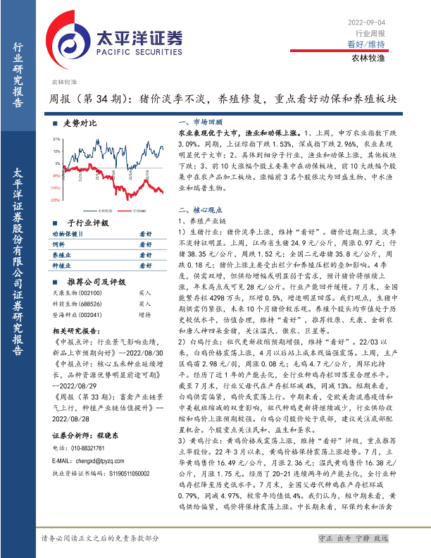 【太平洋证券】【20220904】20220904-太平洋-农林牧渔周报(第34期):猪价淡季不淡,养殖修复,重点看好动保和养殖板块-16页