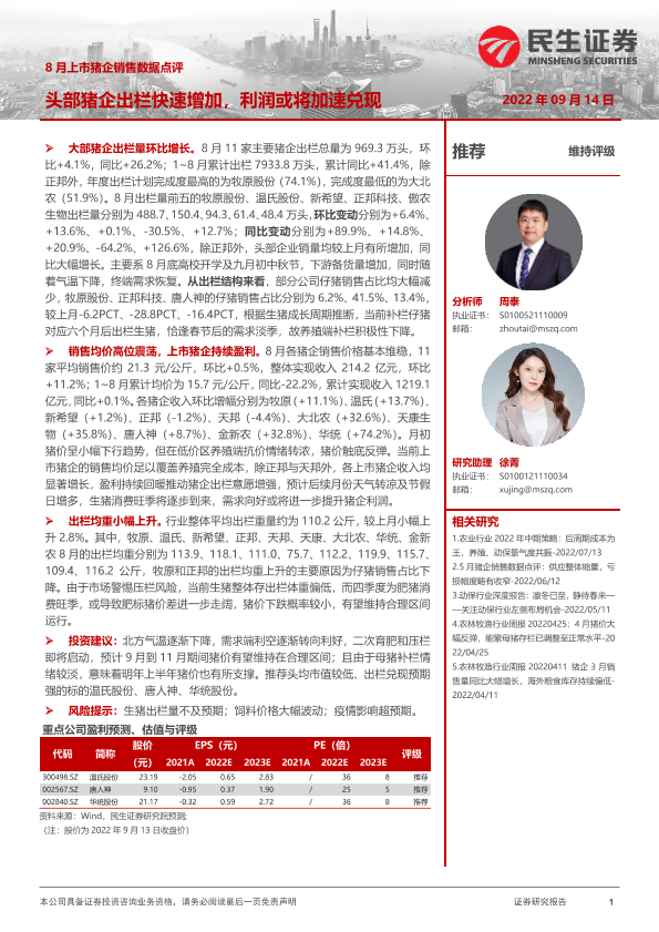【民生证券】【20220914】8月上市猪企销售数据点评:头部猪企出栏快速增加,利润或将加速兑现-2页