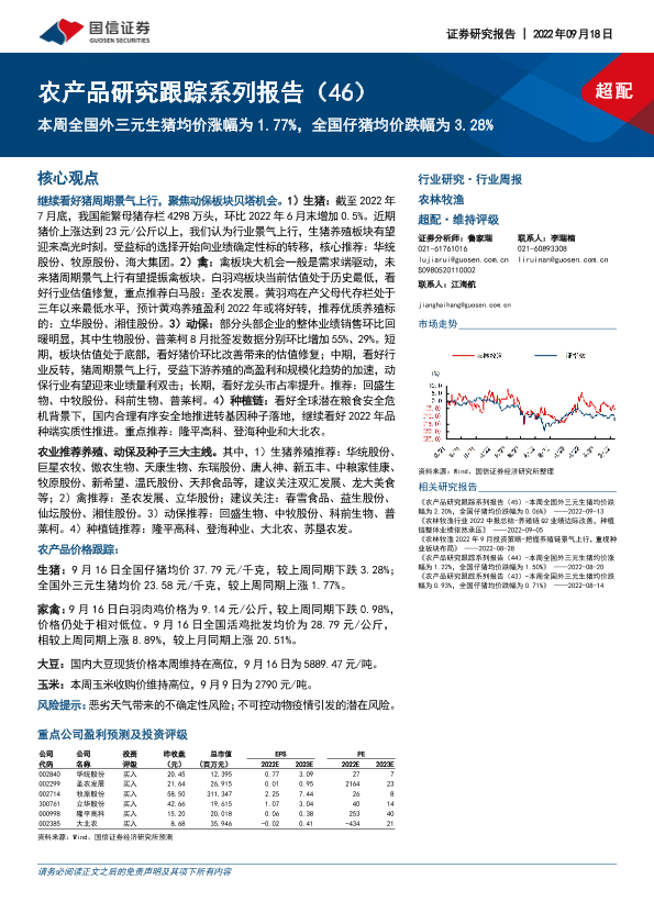 【国信证券】【20220918】20220918-国信证券-农产品研究跟踪系列报告(46):本周全国外三元生猪均价涨幅为1.77%,全国仔猪均价跌幅为3.28%-21页