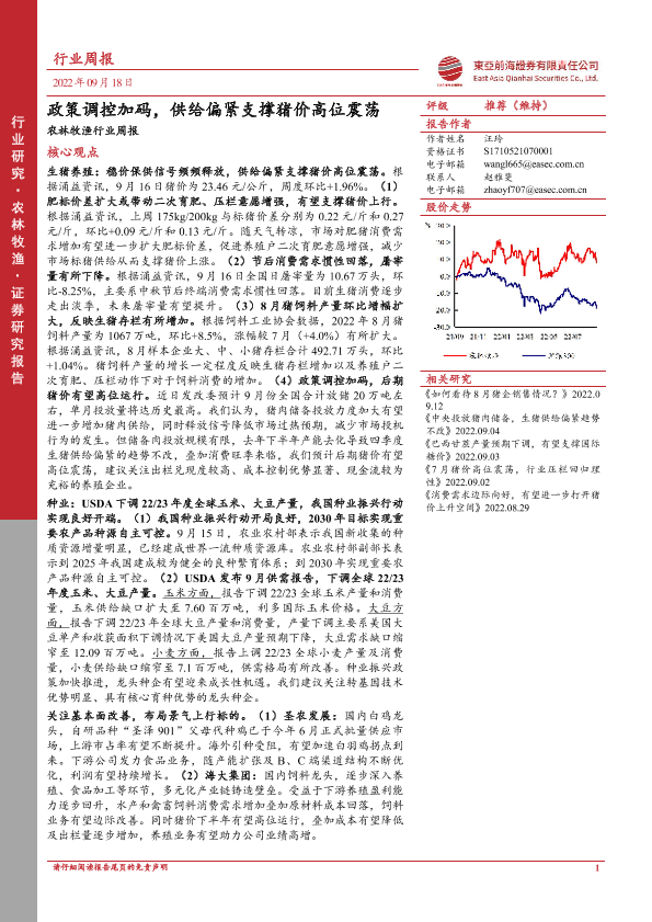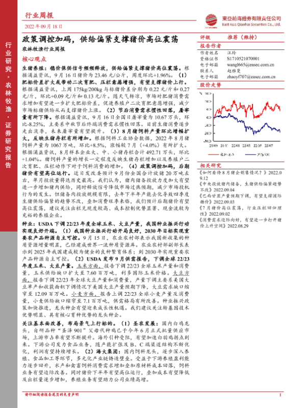【东亚前海证券】【20220918】20220918-东亚前海证券-农林牧渔行业周报:政策调控加码,供给偏紧支撑猪价高位震荡-18页