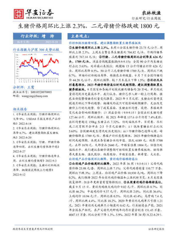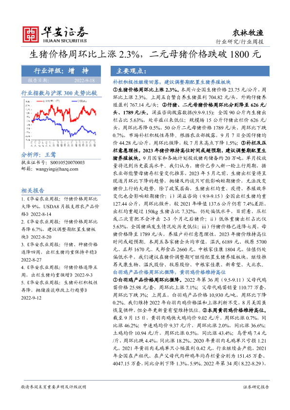 【华安证券】【20220918】20220918-华安证券-农林牧渔行业周报:生猪价格周环比上涨2.3%,二元母猪价格跌破1800元-40页