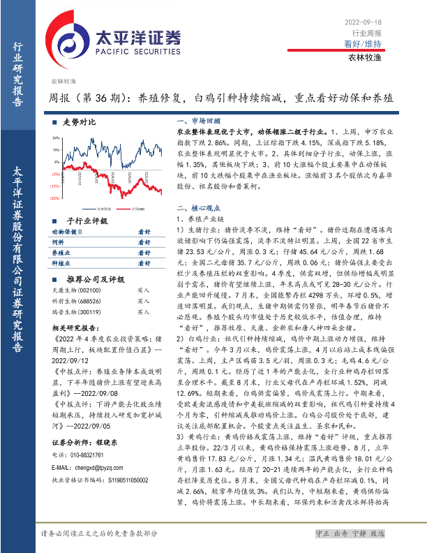 【太平洋证券】【20220918】20220918-太平洋-农林牧渔周报(第36期):养殖修复,白鸡引种持续缩减,重点看好动保和养殖-16页