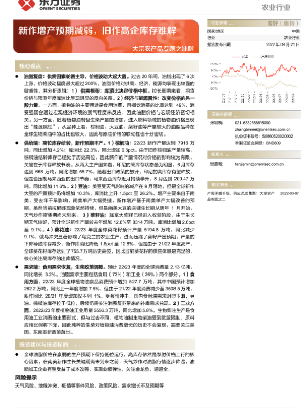 【东方证券】【20220921】农业行业深度报告:大宗农产品专题之油脂-新作增产预期减弱,旧作高企库存难解-27页