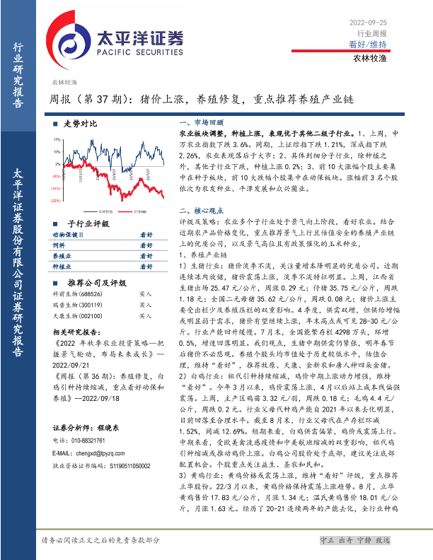 【太平洋证券】【20220925】20220925-太平洋-农林牧渔周报(第37期):猪价上涨,养殖修复,重点推荐养殖产业链-16页