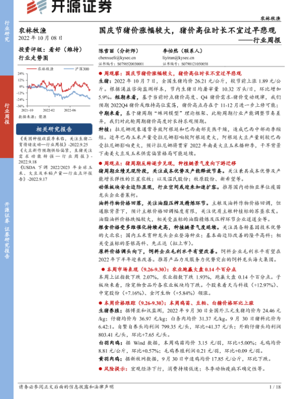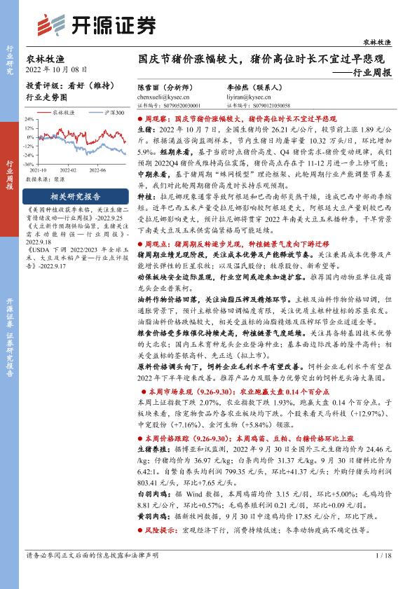 【开源证券】【20221008】20221008-开源证券-农林牧渔行业周报:国庆节猪价涨幅较大,猪价高位时长不宜过早悲观-18页