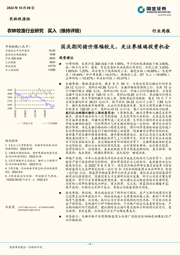 【国金证券】【20221009】20221009-国金证券-农林牧渔行业研究:国庆期间猪价涨幅较大,关注养殖端投资机会-16页