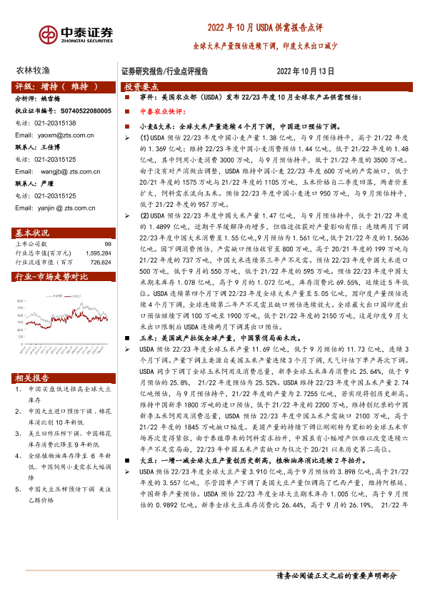 【中泰证券】【20221013】2022年10月USDA供需报告点评:全球大米产量预估连续下调,印度大米出口减少-11页