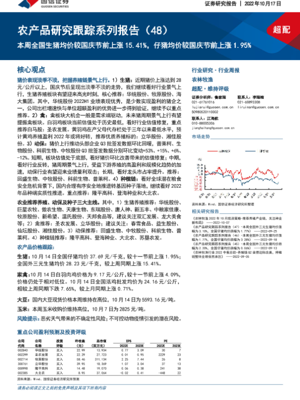 【国信证券】【20221017】20221017-国信证券-农产品研究跟踪系列报告(48):本周全国生猪均价较国庆节前上涨15.41%,仔猪均价较国庆节前上涨1.95%-21页