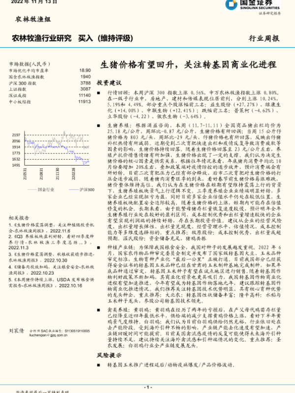 【国金证券】【20221113】20221113-国金证券-农林牧渔行业周报:生猪价格有望回升,关注转基因商业化进程-15页