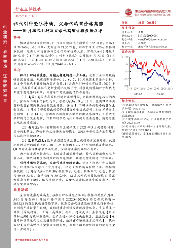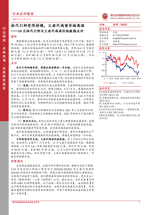 【东亚前海证券】【20221117】10月祖代引种及父母代鸡苗价格数据点评:祖代引种受限持续,父母代鸡苗价格高涨-4页