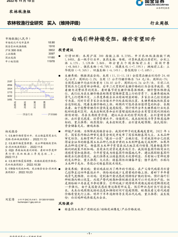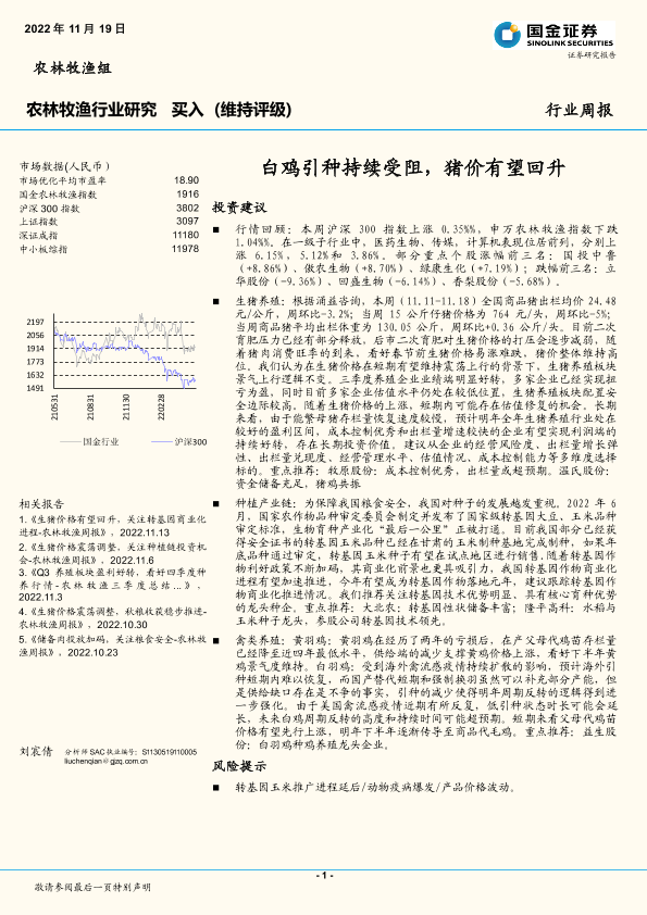 【国金证券】【20221119】20221119-国金证券-农林牧渔行业研究:白鸡引种持续受阻,猪价有望回升-16页