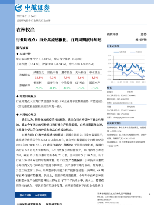 【中航证券】【20221126】农林牧渔行业周观点:海外禽流感催化,白鸡周期演绎加速-13页