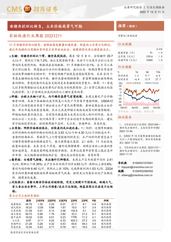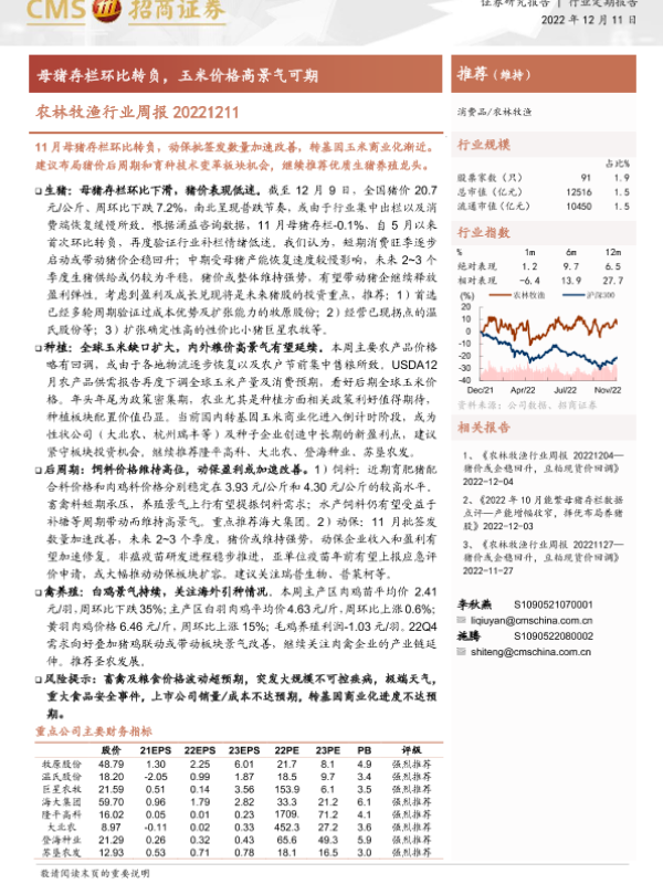 【海通证券】【20221211】农林牧渔行业周报:母猪存栏环比转负,玉米价格高景气可期-13页