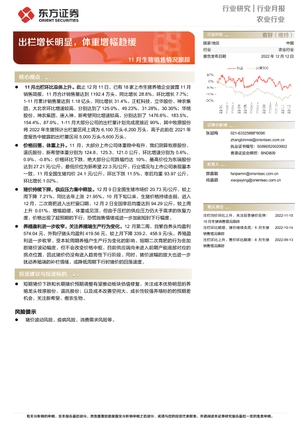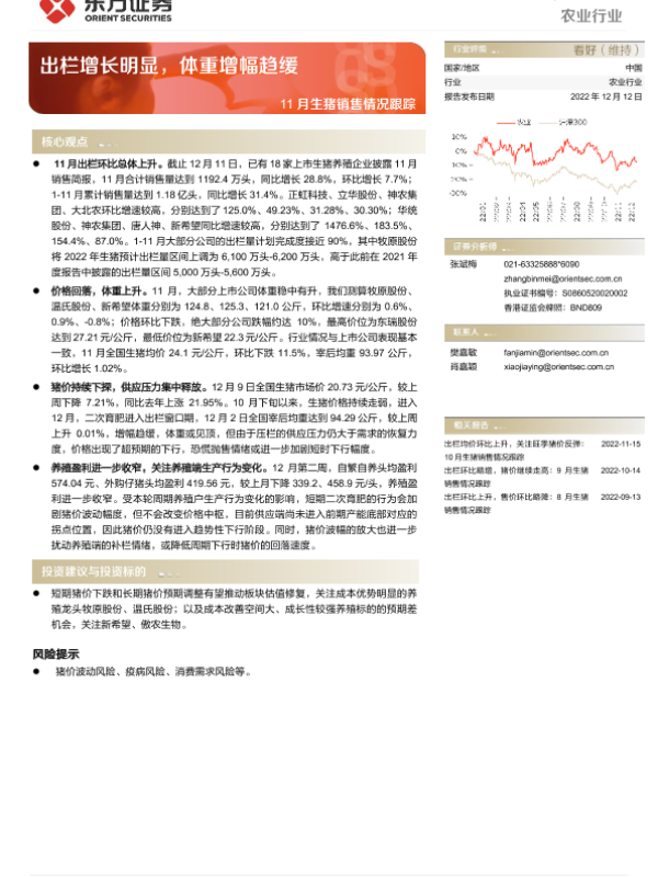 【东方证券】【20221212】农业行业月报:11月生猪销售情况跟踪-出栏增长明显,体重增幅趋缓-8页