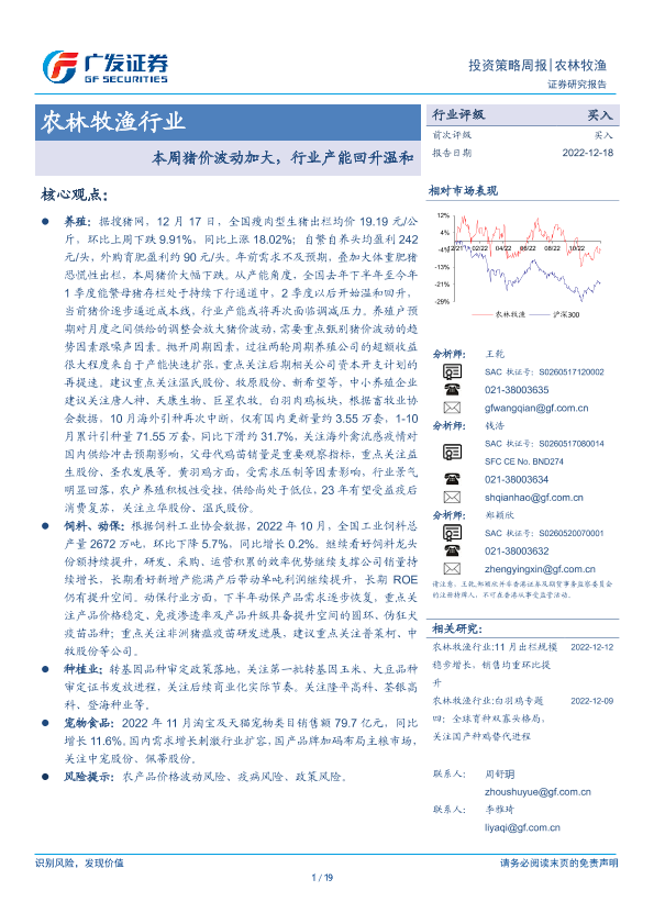 【广发证券】【20221218】20221218-广发证券-农林牧渔行业投资策略周报:本周猪价波动加大,行业产能回升温和-19页