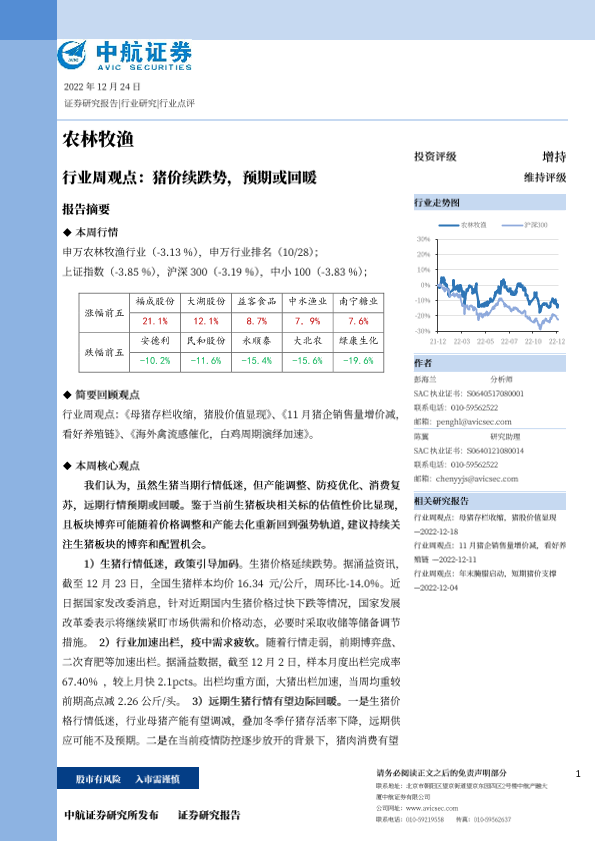 【中航证券】【20221224】农林牧渔行业周观点:猪价续跌势,预期或回暖-14页