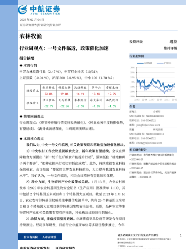 【中航证券】【20230204】农林牧渔行业周观点:一号文件临近,政策催化加速-13页