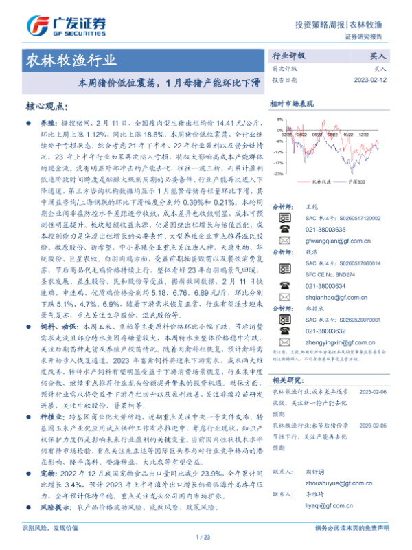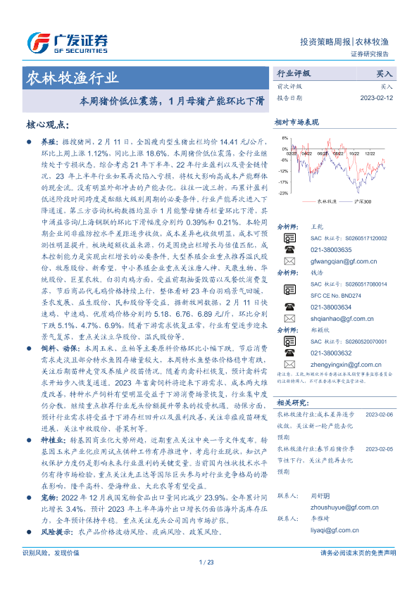 【广发证券】【20230212】20230212-广发证券-农林牧渔行业投资策略周报:本周猪价低位震荡,1月母猪产能环比下滑-23页
