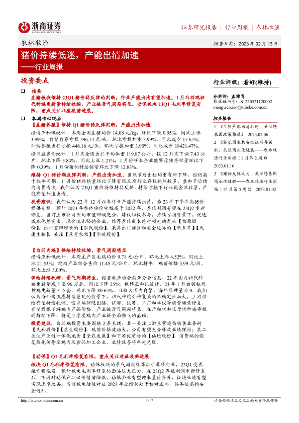 【浙商证券】【20230213】20230213-浙商证券-农林牧渔行业周报:猪价持续低迷,产能出清加速-17页