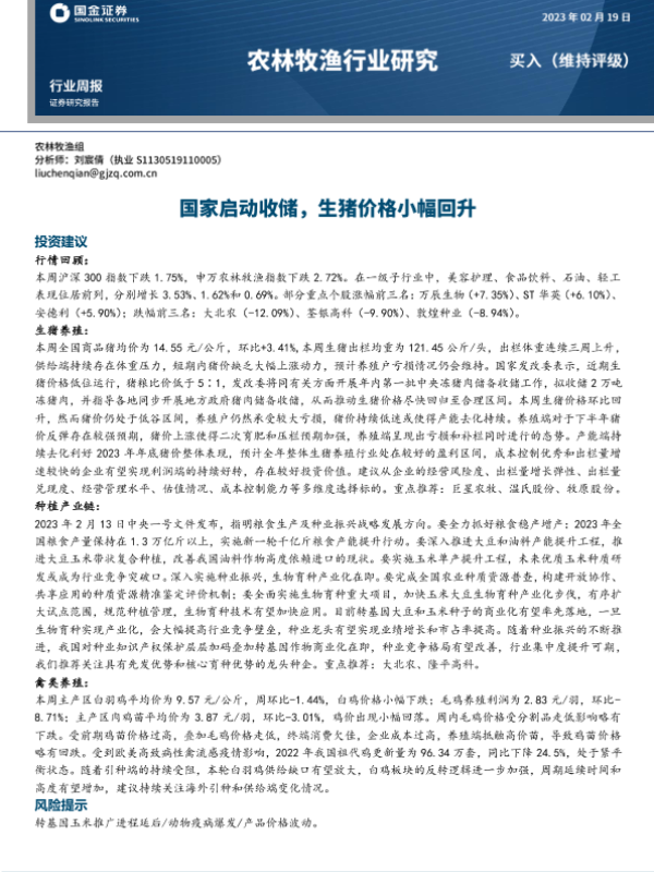 【国金证券】【20230219】20230219-国金证券-农林牧渔行业研究:国家启动收储,生猪价格小幅回升-16页