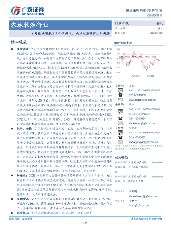 【广发证券】【20230305】20230305-广发证券-农林牧渔行业投资策略月报:2月板块跑赢2.7个百分点,关注近期猪价上行趋势-24页