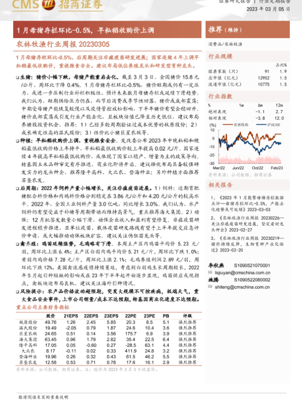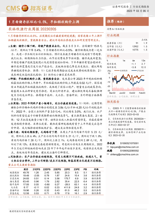 【海通证券】【20230305】20230305-招商证券-农林牧渔行业周报:1月母猪存栏环比-0.5%,早籼稻收购价上调-14页