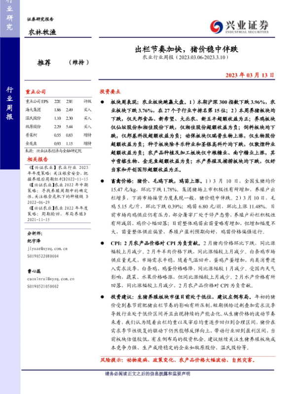 【兴业证券】【20230313】20230313-兴业证券-农业行业周报:出栏节奏加快,猪价稳中伴跌-16页